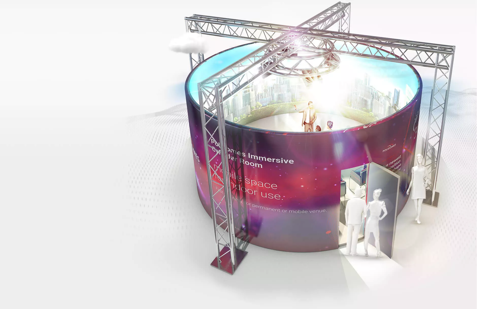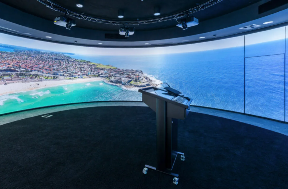 Drie beamers projecten het beeld op een scherm van 200 graden: